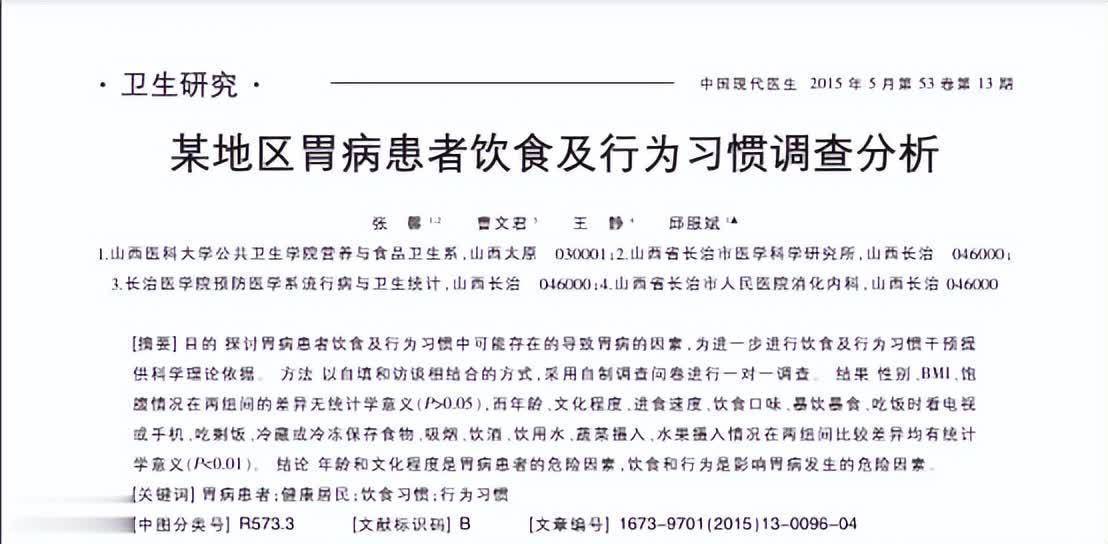 参考文献[1]张馨.某地区胃病患者饮食及行为习惯调查分析,中国现代医生,2015-05-08